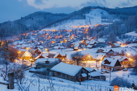 Snowy village at dusk, warm lights, peaceful winter scene, copy space
