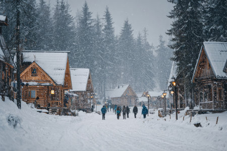 A group of people strolls down a snow-covered path in a cozy village. Wooden houses dot the landscape, and tall pine trees stand proudly under the falling snow.