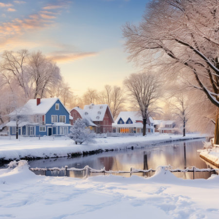 Serene snowy town at dawn, with frosted houses and glowing windows.