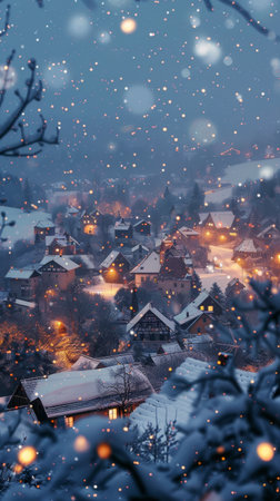 Snow blankets the charming village, with cozy cottages sparkling under festive lights. The peaceful atmosphere invites warmth and joy, perfect for embracing the holiday spirit of winter.