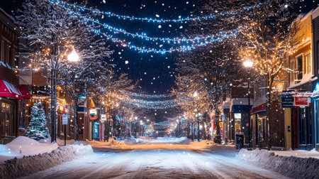Winter season. A picturesque small town covered in snow, with charming storefronts adorned in holiday lights