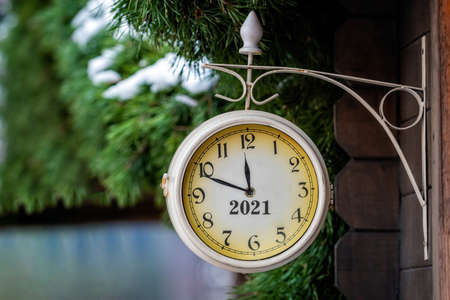 vintage street clock on the wall of a wooden building, the clock shows that there are only a few minutes left until 2021, new year concept