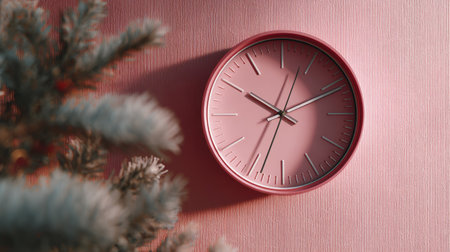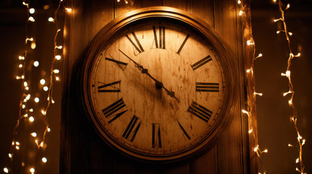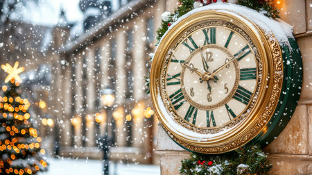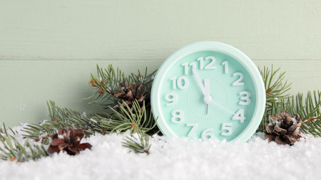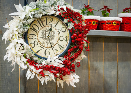 cozy holiday scene with clock, snowdusted fir branches with festive clock and berries scene
