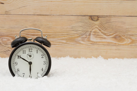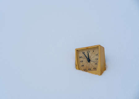 Old mechanical alarm clock in a snowdrift. Countdown to midnight. Christmas and New Years start concept. Copy space.