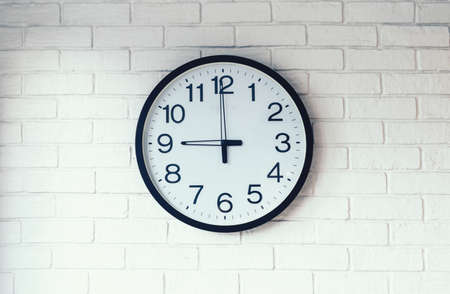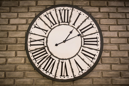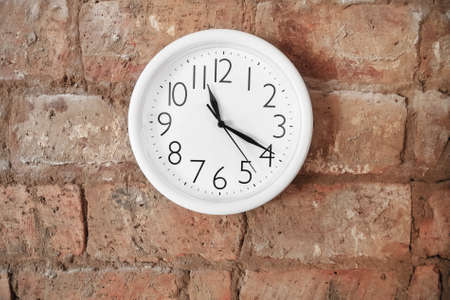 Lunch time concept. A part of white round analog clock face against the background of a red brick wall is showing lunch time.