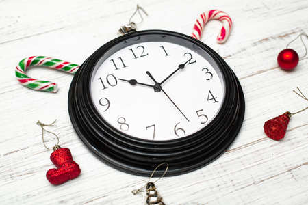 Christmas clock with winter decoration on snow. Happy new year concept.