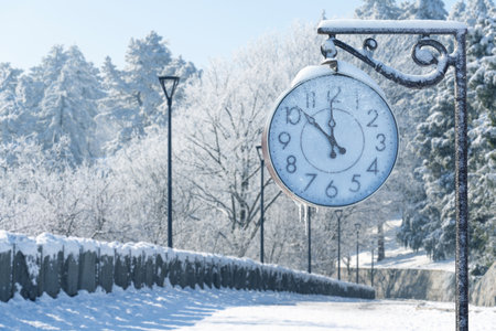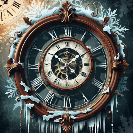 Close-up of a clock with ice dripping. The time is almost midnight.