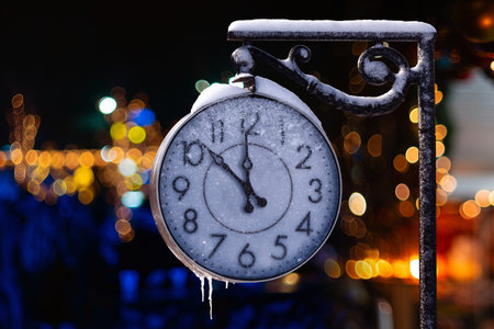New Years vintage clock on city street. The concept of New Year and Christmas holidays. Blurred effect.