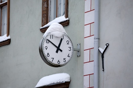 Close up of a snow-covered city clock on a forged pole. Winter postcard of European city street