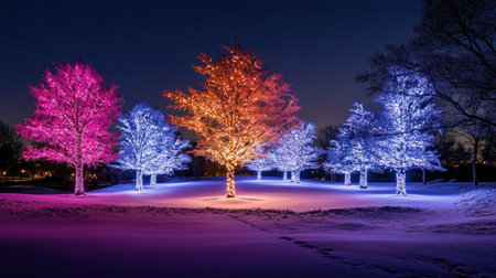 A stunning display of colorful illuminated trees brightens up a serene winter landscape at night, creating a magical and tranquil atmosphere in nature.