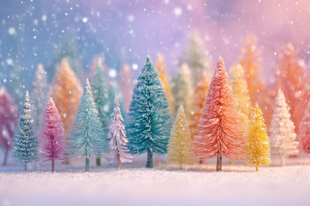 Colorful miniature Christmas trees create a whimsical winter wonderland in vibrant hues during the festive holiday season