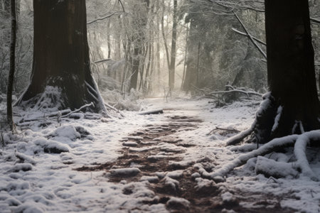 A snow covered forest path with tall evergreen trees creates serene winter landscape. scene evokes sense of tranquility and natural beauty