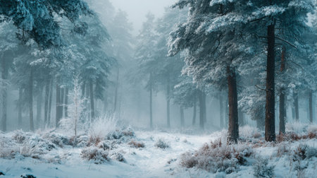 Fog blankets a tranquil forest at dawn, sunlight filters through tall trees, creating a mystical atmosphere. Snow dusted plants contrast with dark tree trunks, enhancing natures beauty.