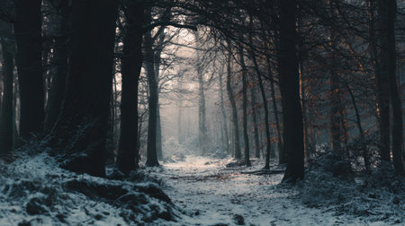 A long path winds through a snow-covered forest, flanked by tall trees. The scene is illuminated by soft, natural light, creating a tranquil atmosphere. The composition emphasizes perspective, leading the viewer's eye into the distance. This image is suitable for various commercial uses, including illustrations and backgrounds.