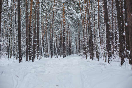 Ski trail in the snowy winter forest. Cross-country skiing. Snowy winter in the forest. Beauty of pine trees in winter.