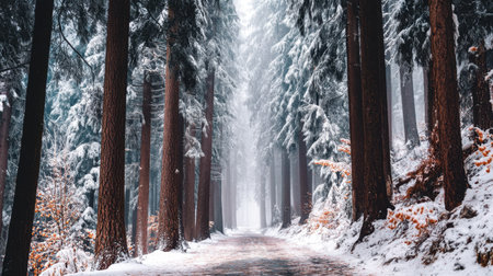 Discover a peaceful winter forest featuring a snowy pathway surrounded by towering evergreen trees, creating a magical atmosphere filled with tranquility and natural beauty.
