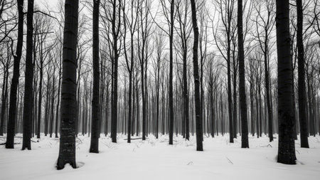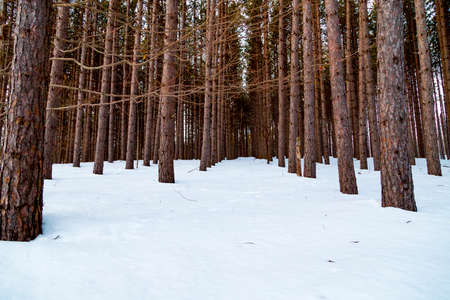 A dense forest of tall trees with snow-covered branches standing in a snowy landscape on a cold winter day. Clear details and vibrant colors enhance visual appeal. resolution use.
