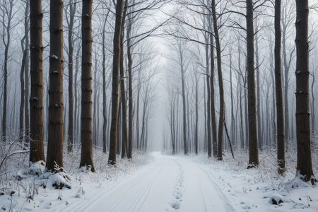 A serene winter forest pathway cloaked in snow and fog, showcasing towering trees and a tranquil atmosphere perfect for outdoor exploration or relaxation.