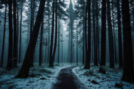 Snow covered evergreen trees lining a remote path through a cold, misty forest