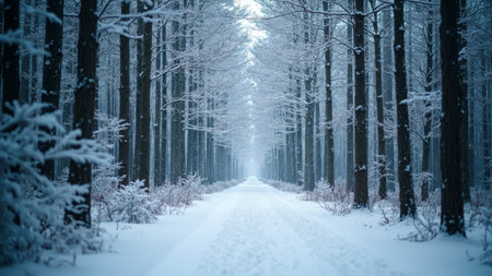 A snow-covered pathway leads through a dense forest of tall evergreen trees in this scenic winter landscape. The scene features a symmetrical composition with the trees lining the path, creating a sense of depth. Soft lighting enhances the winter atmosphere, offering potential use for environmental and seasonal content.