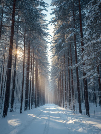 Enchanting Winter Forest Path with Tall Snow Covered Pine Trees