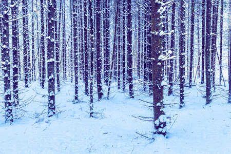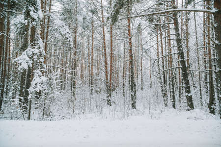 Snowy pine forest in the winter morning. Winter nature. Nature winter background. Christmas background