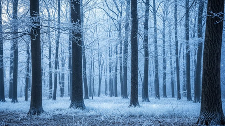 A serene and atmospheric view of a winter forest. Tall, dark tree trunks stand amidst a landscape covered in frost and ice. The branches of the trees are delicately coated in white frost, creating intricate patterns against the pale blue and gray tones of the scene. The ground is also covered in a layer of frost, giving it a sparkling, icy appearance. The overall mood is tranquil, cold, and slightly magical.
