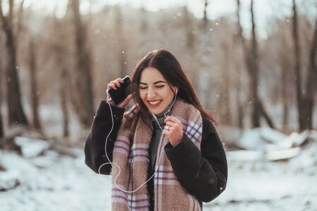 Beautiful woman in warm outerwear enjoying music on wireless headphones in cold weather