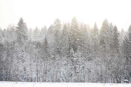 Winter snowy fir tree forest. Winter Nature landscape outdoor background. Toned.