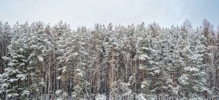 Landscape in the winter cloudy day of snow-covered fields and forests