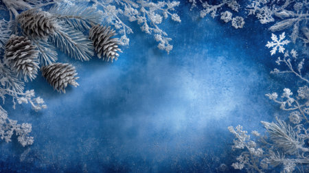 Captivating winter background featuring frosted pine cones and delicate snowflakes set against a vibrant blue ice texture, perfect for holiday designs and seasonal projects.