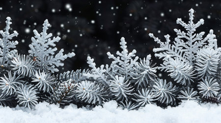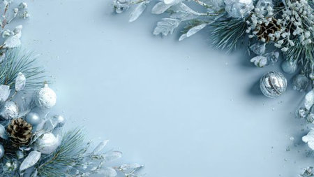 Frosted pine branches frame serene winter background, creating peaceful and festive atmosphere perfect for holiday themes and seasonal decorations