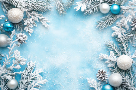 Winter decor with frosted pine branches and white ornaments on a blue backdrop