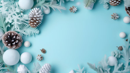 A beautiful top view of winter holiday ornaments and pine cones surrounded by snow, ideal for festive decorations and seasonal inspiration.