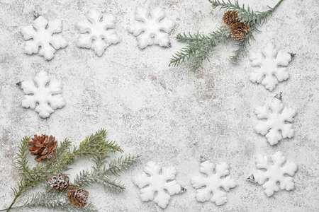 Frame made of snowflakes and fir tree branches on grunge background