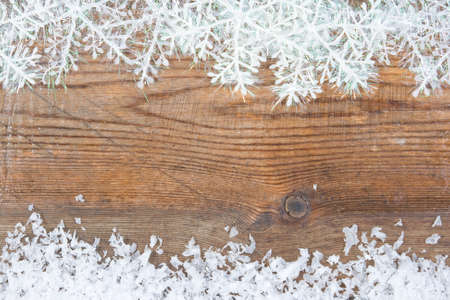 Wooden background with winter snow on the border and copyspace for your Christmas text