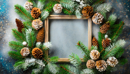 Christmas holiday background, frame with fir branches and cones, winter season greeting card with copy space