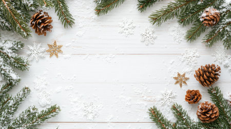 Cozy white Christmas background with snowflakes, pine cones, and evergreen branches on a wooden surface, top view