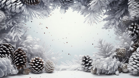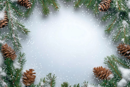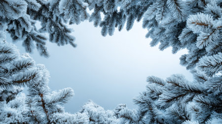 Frosted pine branches frame serene winter background, creating peaceful and festive atmosphere perfect for holiday themes and seasonal decorations