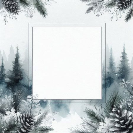 A serene, watercolor background featuring evergreen trees, pine cones, and delicate snowflakes, providing a beautiful winter frame.