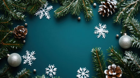 A beautiful festive background featuring green pine branches, silver ornaments, and delicate snowflakes, perfect for winter celebrations and holiday decorations.