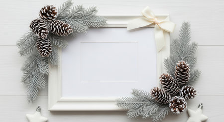 A festive white frame adorned with natural pine cones and frosted evergreen branches, accented with a delicate ribbon, set against a clean white wooden background, perfect for holiday greetings or winter designs.