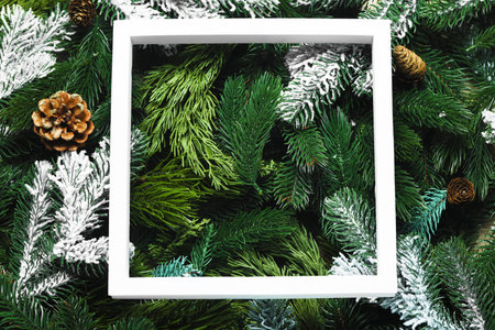 Frame on artificial fir tree branches and cones, top view with space for text. Christmas decor