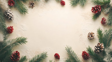 Evergreen branches with pinecones create a festive winter atmosphere against a light snowy surface perfect for seasonal decorations.