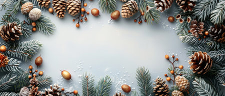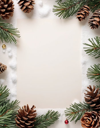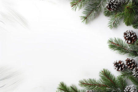 a frame of fir branches and pine cones on a clean white background, evoke the essence of the Christmas season and New Year celebrations, with a flat lay perspective, top view,