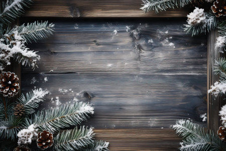 Rustic winter-themed wooden background, blank space with snowflakes and pinecones, festive design