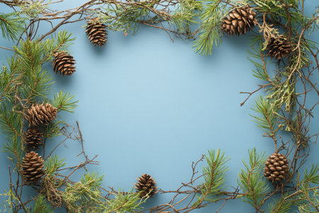 Festive Christmas tree branches with pine cones on a vibrant blue background.