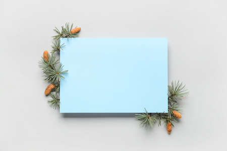 Defocus blank white card on natural christmas background. Creative layout made of Christmas tree branches with paper card note. Decorative festive frame. Out of focus.