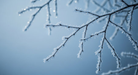 Delicate showing close-up of delicate tree branches covered in sparkling frost crystals against a soft blue background. resolution