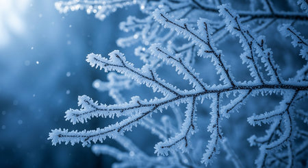 Frost-covered branches in winter, close-up view. Natures delicate beauty concept